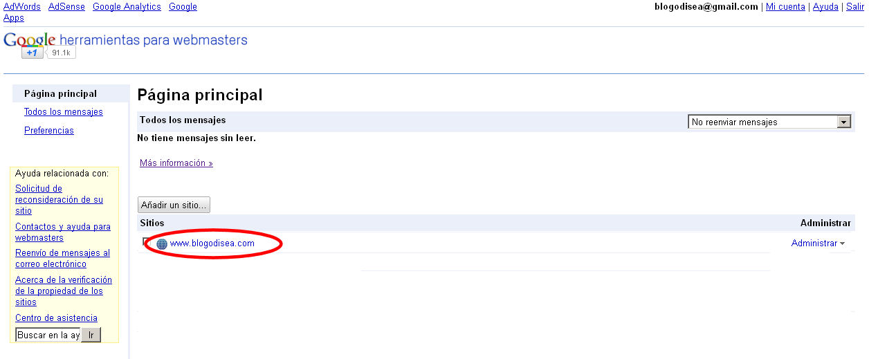 También podemos emplear la herramienta de Google Webmasters asociada a una cuenta Google. Entramos en Google Webmasters y si no tenemos añadido el sitio, debemos hacerlo primero. En este ejemplo ya tenía añadida esta página.