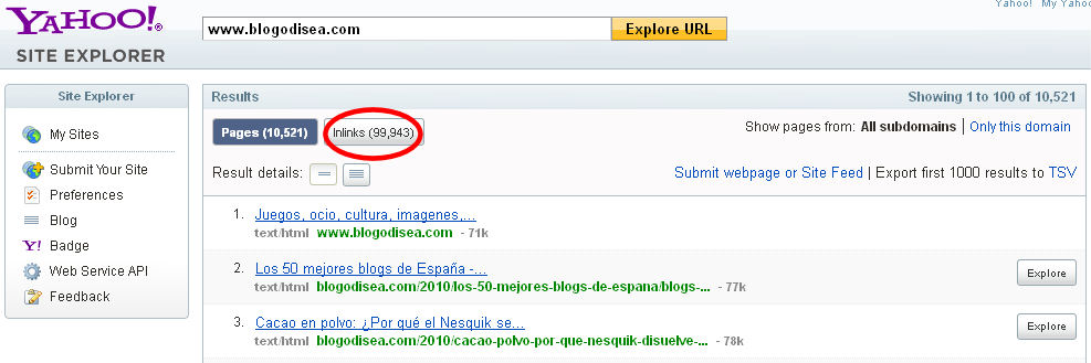 En la siguiente pantalla nos fijaremos en el número que aparece en el botón junto a INLINKS. Esa es la cantidad de enlaces entrantes de nuestro sitio web según Yahoo.