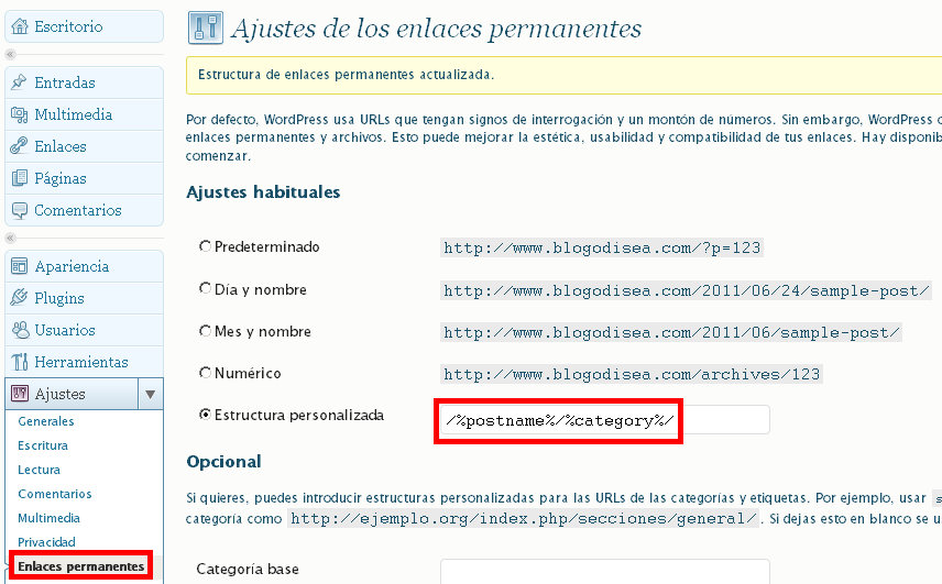 WordPress ofrece una gran flexibilidad a los creadores de páginas para determinar las URLs. Existen varios atributos que pueden ser empleados y ordenados como uno quiera. La estructura de permalink correcta que viene por defecto es esta: