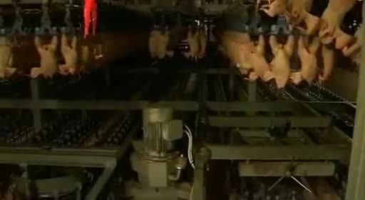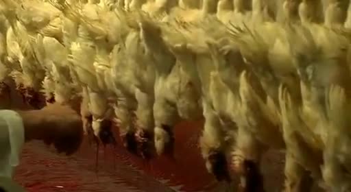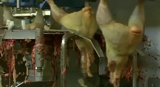 Luego unas cuchillas rotatorias cortan un poco los cuellos para que los pollos se desangren, se despluman con agua caliente, unas cuchillas les cortan las patas y otra máquina les arranca la cabeza que tienen colgando. También se ve cómo otro proceso mecanizado les quita las entrañas y se separan los diferentes órganos o partes. Finalmente se empaquetan y llegan listos a los mostradores de los supermercados, donde la gente los compra sin conocer el calvario y proceso que se ha producido antes de llegar ahí.