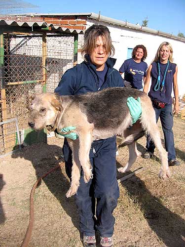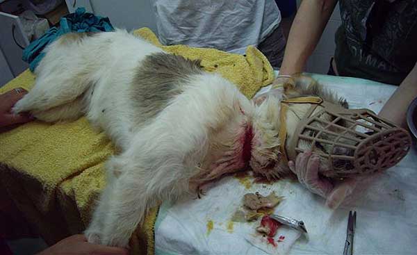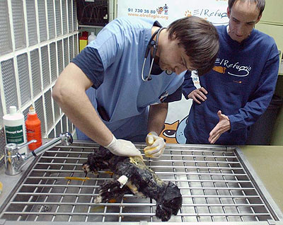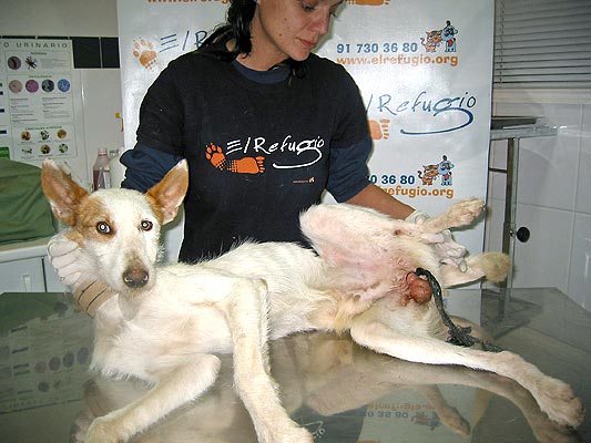 Una voluntaria de El Refugio muestra a Spiderman, un perro que llevaba desde finales de octubre abandonado en la localidad de Villahermosa (Ciudad Real), con los testículos estrangulados por una cuerda de nailon. El animal, de tres años de edad, presentaba un estado general deplorable, muy desnutrido, anémico, y con fiebre. Este tipo de prácticas sirven para castrar de forma económica y brutalmente cruel a los perros para que no monten a las perras.