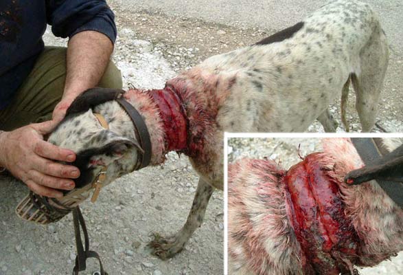 Este perro de caza estuvo vagando por las calles de un pueblo días y días en las condiciones que se puede observar: el cuello en carne viva debido a la presión de la soga con la que intentaron asesinarle.