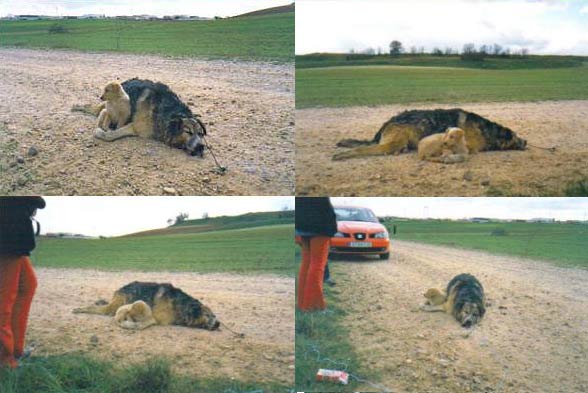 Un cachorro de menos de dos meses defiende el cadáver de su madre, tendido en medio de un camino a cinco kilómetros de Zamora. La madre, que aparentemente llevaba un día muerta, había sido estrangulada y su cachorro gruñía a las personas que se le acercaban, intentando atacarles.