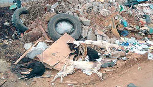 50.000 galgos son asesinados todos los años en España, ha denunciado una protectora andaluza y Los Verdes. En la imagen, cinco galgos asesinados de un tiro en una escombrera en Zamora.