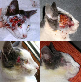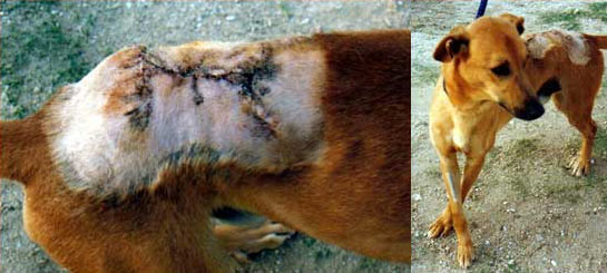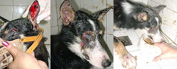 Chillando de dolor y dando tumbos por la cuneta. Así encontraron a Nataku, un cruce de collie. Nataku estaba destrozado, física y psicológicamente. Le habían echado liquido corrosivo en la cabeza y se la abrasaron entera, incluidos los ojos y las orejas por dentro. En un intento desesperado por quitarse aquel dolor tan horrible se rascó con las patas delanteras y el líquido le afectó también a las mismas. Le habían arrancado un diente, estaba achicharrado, casi ciego, con una inflamación brutal en los ojos. Nataku ya no está entre nosotros, no consiguió salir adelante.