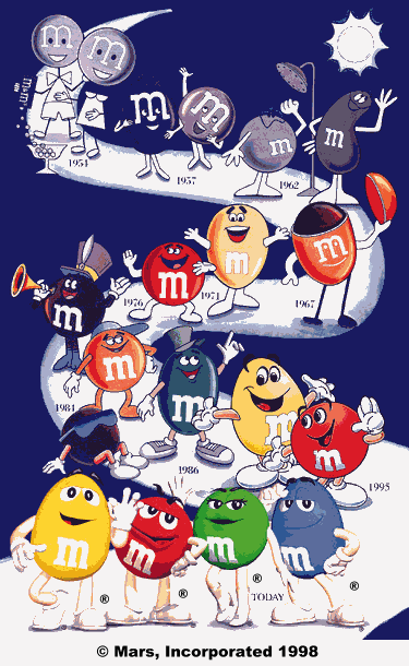 En 1954 aparecieron los cacahuetes cubiertos de chocolate, nacieron las primitivas mascotas asociadas a la marca y el eslogan que hasta hoy perdura: “Se derriten en tu boca, no en tu mano”, que apareció en los primeros anuncios de televisión.