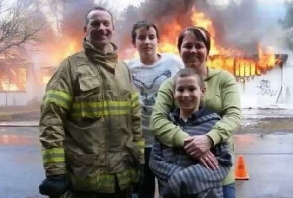 Esta es la mejor, haciéndose una foto familiar mientras todo arde. ¡Pero qué orgullosos están de su padre bombero!
