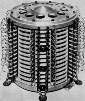 Memoria de tambor (a la izquierda) y tarjeta perforada patentada por Herman Hollerith en 1887 (a la derecha).
