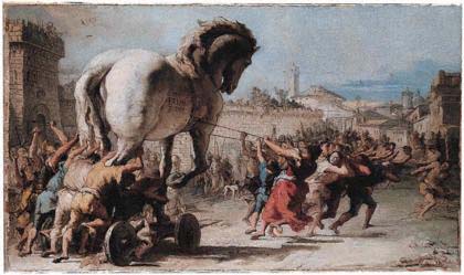 Los troyanos, invadidos por la curiosidad, se llevaron el caballo dentro y cuando menos lo esperaban, vieron saltar de su interior a los griegos, que asolaron la ciudad y mataron a sus habitantes.