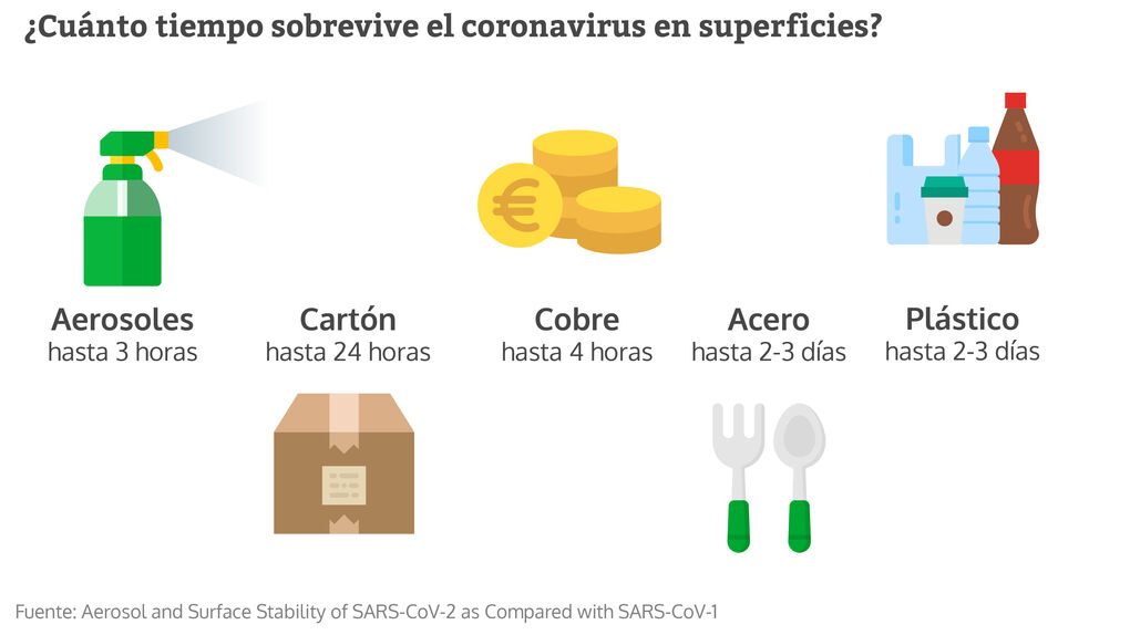 Pero el estudio del NIH encontró que el virus del SARS-CoV-2 sobrevive más tiempo en el cartón (hasta 24 horas) y hasta 2 ó 3 días en superficies como el plástico o el acero inoxidable.