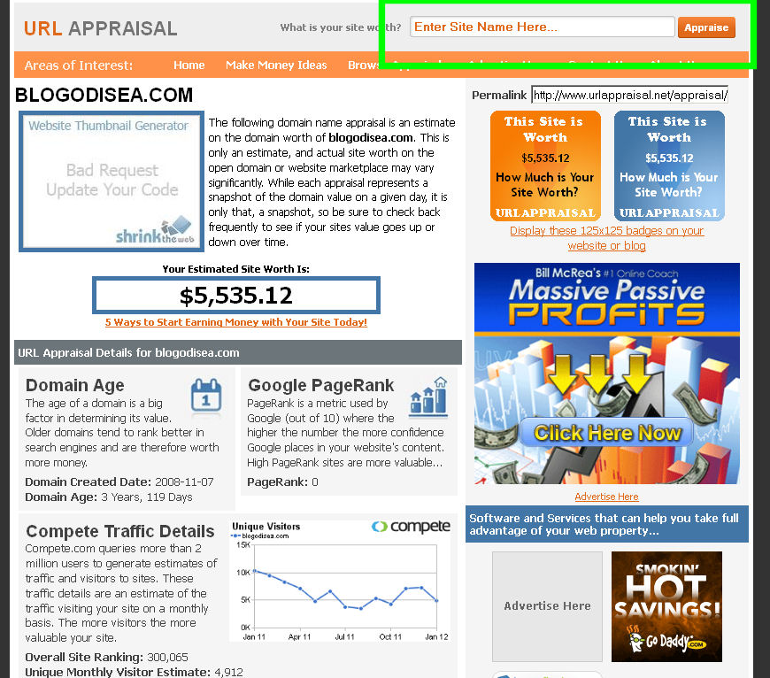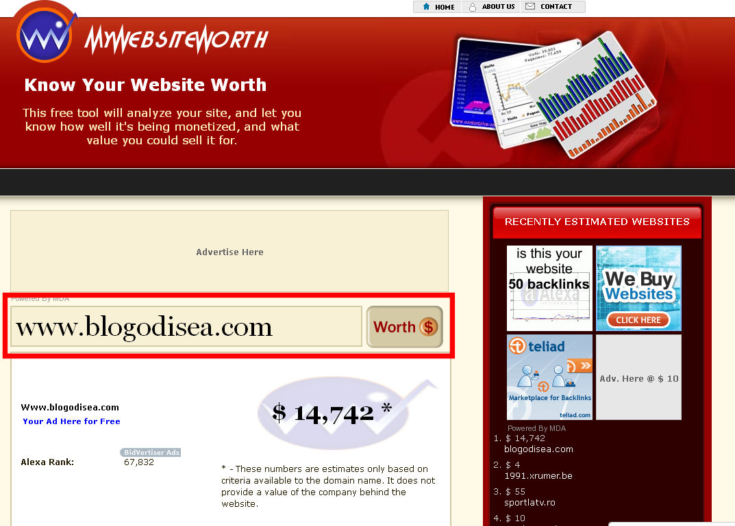 Este es el calculador que nos da la cifra más reducida, basándose en los siguientes factores: antigüedad del dominio, Pagerank, ranking de Alexa y Compete o enlaces de Google y Yahoo. Con este me salieron 5.535 dólares.