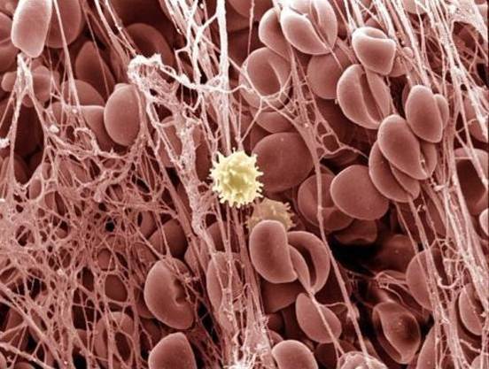 Este es un coágulo de sangre, donde vemos varios glóbulos rojos atrapados y un leucocito en el medio.
