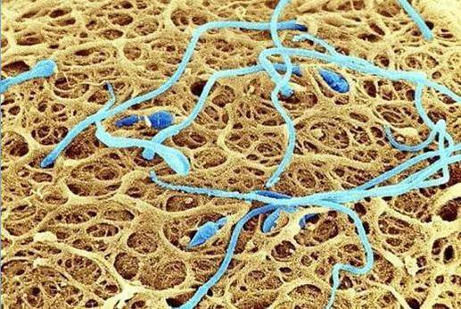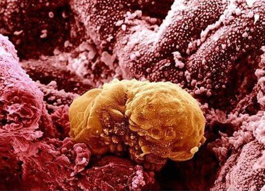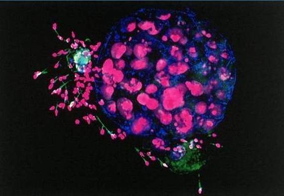 Un embrión humano de 5 días, con algunos restos de espermatozoides rodeándole (manchas moradas y verdes). Las zonas azules identifican los nexos entre células del embrión.