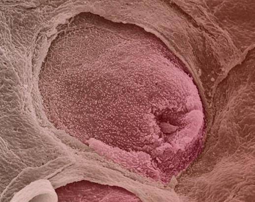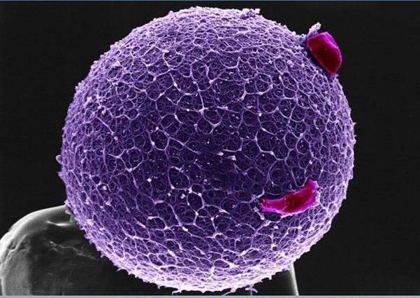 Óvulo que descansa sobre la punta de un alfiler. Las dos células moradas pertenecen a la corona y se hallan adheridas a capa pellicuda, que es la que ayuda a retener los espermatozoides.