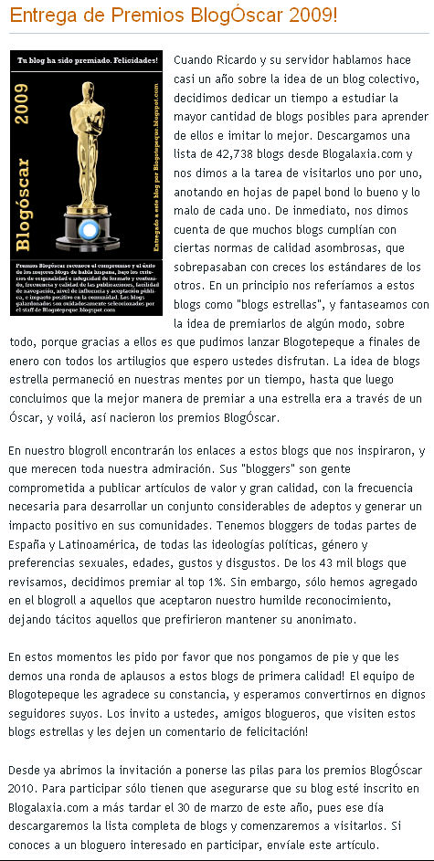 Eso sí, te exigían que para recoger el premio, y salir en su barra lateral, tenías que publicar un código html que pondría el logo del premio y un enlace a una página paralela. Porque, aunque los premios los daban en http://premiosblogoscar.blogspot.com, el que lo concedía era el blog http://www.blogotepeque.blogspot.com/, un blog hermano.