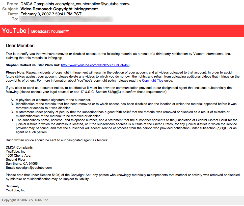 Pero ayer me mandaron un correo, acerca de los vídeos que subí para la entrada de La página web de Mister X (Homer de webmaster), una entrada que también tiene justamente un año de antigüedad. Recibí un correo de parte de Youtube en el que me avisaban que la FOX les había pedido retirar dos vídeos que acompañaban la entrada.