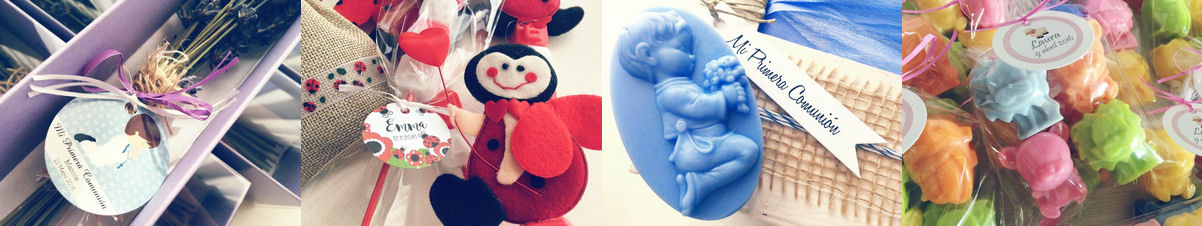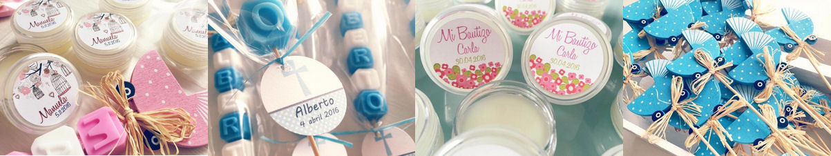 En esta sección igualmente encontramos algunos de los detalles que sirven para cualquier festejo, pero también se incorporan algunos relacionados con los bebés y más pequeños. Encontraremos dulces, piruletas, productos de cosmética y cuidado de la piel, jabones y demás artículos de colores pastel y diseños suaves, en los que abundan los motivos de bebés, carricoches, angelitos y otros relacionados con los más pequeñines.