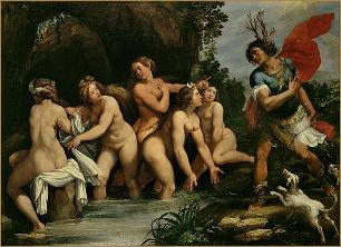 Las ninfas, al advertir el ruido y viendo que el ramaje se estremecía, lanzaron un grito de espanto. Diana se indignó contra el cazador temerario y recogiendo el agua de la corriente en el hueco de su mano, se la echó en la cara.