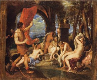 Allí Diana, que estaba cansada de sus largas correrías, acababa de llegar con las ninfas que formaban su séquito con el propósito de bañarse. Acteón, que vagaba por el bosque sin rumbo fijo, tuvo la desgracia de penetrar en este vallecito y acercarse al mismo riachuelo.