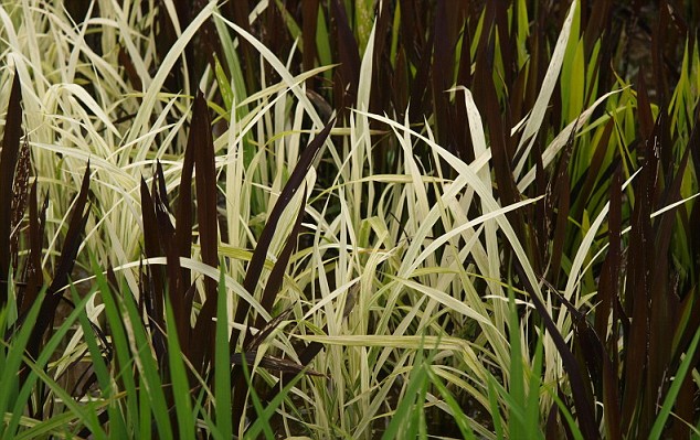 Entre las cuatro variedades de plantas de arroz, destacan la de color verde de Tsugaru y otra de color morado y amarillo de Kodaimai.