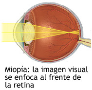 Este es el defecto contrario a la hipermetropía, en el que los rayos llegan a la retina antes de confluir. La causa de la miopía no se conoce exactamente, aunque una razón primordial es el factor genético. Generalmente la miopía se presenta en la infancia, en el transcurso de la etapa escolar, evolucionando durante el crecimiento para estabilizarse hacia los 20 años.