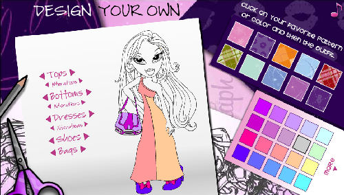Uno de los mejores juegos para vestir que he visto de las Bratz. No sólo las vestimos, sino que las diseñamos enteras, partiendo de escoger a nuestra Bratz preferida, al a que podremos customizar con trajes, pantalones, camisetas, zapatos, bolsos, etc…