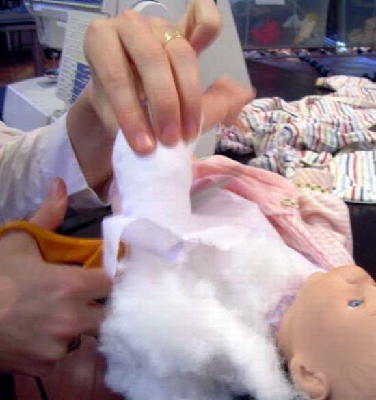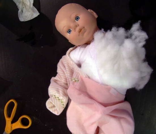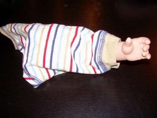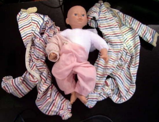 Esta es una buena idea para elaborar un traje de Halloween para bebés. Primero necesitamos dos trajecitos de bebés iguales. Cogemos un muñeco bebé y lo vestimos con uno de los trajes, proveyéndonos de sus brazos para coserlos al otro traje que será para nuestro retoño. De esta manera tendremos un bebé con cuatro brazos, un disfraz ideal para Halloween.