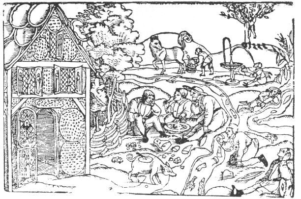 Hay innumerables asadores de gallinas y perdices, los animales portan insertados cuchillos mientras recitan: «engúlleme, engúlleme». Encontramos arroz con leche, cajas de mazapanes, merengues, natillas o toneles de vino dulce que enuncian: «cómeme, bébeme, cómeme, bébeme» a disposición de cualquier persona, y nunca escasean las cazuelas de huevos y queso.
