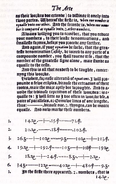El inglés Robert Recode (1510-1558), sugirió en su libro de 1557, “The Whettstone of Witte”, un signo que podía servir para reemplazar la palabra «igual» y economizar tiempo y esfuerzo.