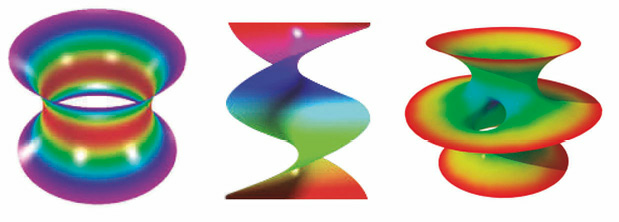 Entre las más sencillas figuran la catenoide (ilustrada a la izquierda a continuación), que corresponde a la membrana mínima que une dos anillos bien dispuestos uno en posición paralela a otro, y el helicoide (al centro), que es la superficie que traza una hélice al girar y simultáneamente subir a lo largo de un eje a velocidad constante. Un ejemplo más sofisticado es la superficie de Costa (a la derecha), denominada así en honor a quien la descubrió en 1984, el matemático brasileño Celso José da Costa.