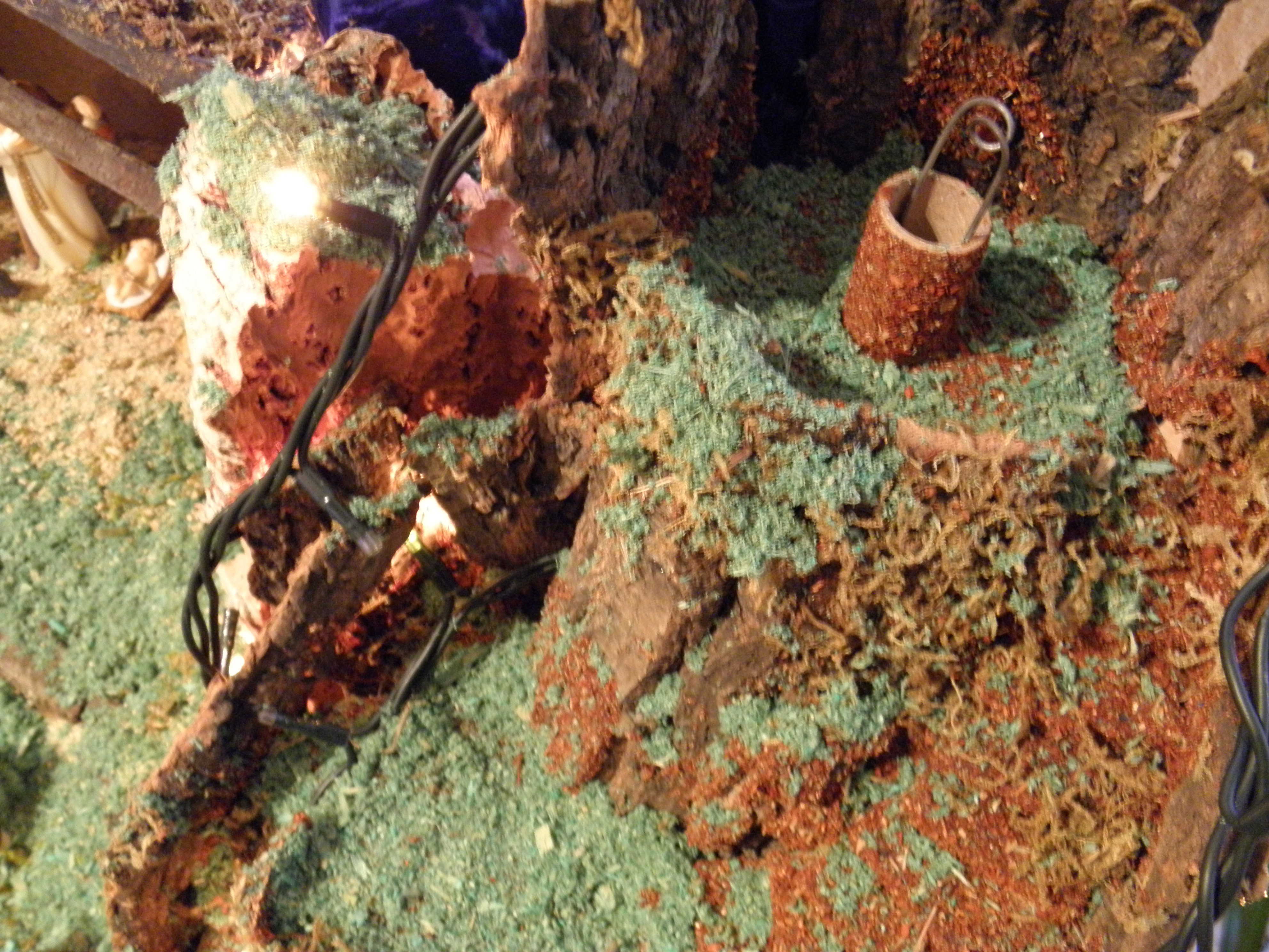 Algo que también quiero mejorar para el próximo belén es la iluminación. Me hubiese gustado haber creado el circuito de iluminación yo mismo, y haber situado luces fijas pequeñas en sitios estratégicos, como detrás de las figuras en cada casa y otros lugares, para darle un ambiente intimista. En su lugar me he tenido que conformar con la típica ristra de bombillitas intermitentes para árboles de Navidad, que no pega mucho con el belén, pero es una asignatura pendiente que resolveré en el belén 2.0 del próximo año. Ahora parece un poco un belén disco con tanto chinchineo en las luces.