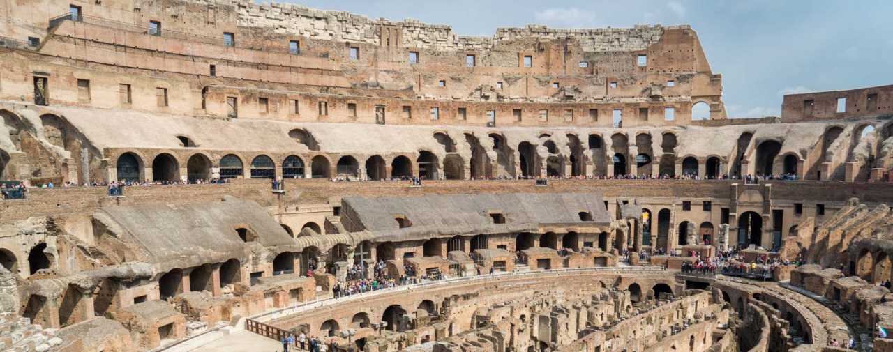 El anfiteatro Flavio, de planta elipsoidal, alcanza 187 metros en su eje mayor, y 155 metros en el menor. Su graderío -de más de 50 metros de altura y 37 grados de pendiente- podía albergar unos cincuenta mil espectadores. El nivel más próximo a la arena estaba reservado al emperador, los cargos oficiales y sus acompañantes; el segundo nivel se destinaba a los nobles y caballeros, el tercero a sus mujeres, mientras que el pueblo debía contentarse con permanecer de pie sobre un graderío de madera en el nivel más alto. Sobre este, unos mástiles sostenían los toldos –vellum– que protegían a los espectadores.