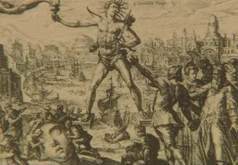 La altura del Coloso era imponente, se habla de 60 metros de altura de una figura humana de planchas de cobre sobre un armazón de hierro.