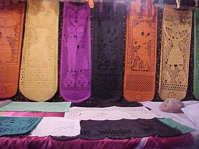 El altar puede ser engalanado también con papel picado, telas de seda y satén donde se dispondrán figuras de barro, un incensario o ropa limpia para recibir a los espíritus.
