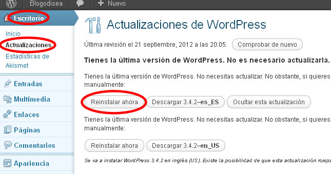 Si el problema persiste, otra solución a este error sería volver a reinstalar WordPress haciéndolo desde el propio panel ESCRITORIO > ACTUALIZACIONES o bajándose los archivos de la página oficial wordpress.org y subiendo de nuevo la instalación por FTP.