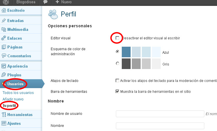 Otro de los errores que podría existir es que el editor visual estuviese deshabilitado. Así que iríamos a USUARIOS > TU PERFIL y verificaríamos que la casilla «Editor visual Desactivar el editor visual al escribir» está desmarcada.