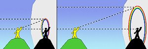 Entre el espectro de Brocken y el arco iris existen varias diferencias, siendo una de ellas que el espectro se refleja en la niebla o en la nubes, mientras que el arco iris se produce tras una lluvia. También se diferencian en el número de anillos, produciéndose más en el espectro de Brocken. Otra disimilitud es el ángulo. En el arco iris el ángulo del radio es de 42º, mientras que en el espectro tan sólo alcanza 3º ó 4º. Esto se puede comprobar en la imagen de abajo, que explica cómo se producen las aureolas de distinto tamaño.