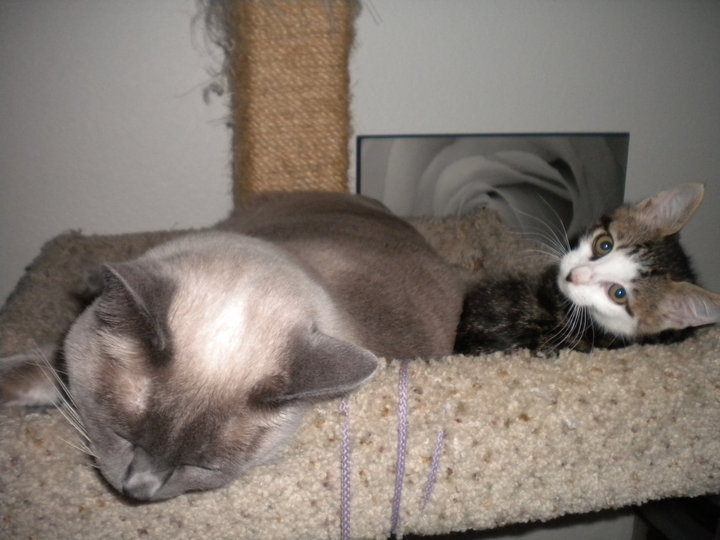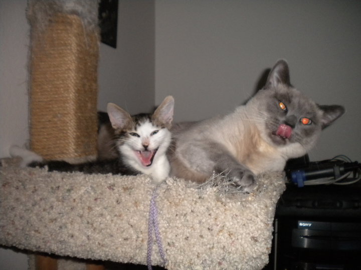 Aquí en esta fotos está con otra gata que también han adoptado de un centro y que actúa como madre sustituta de Dr. Jack Schrodinger, que aparece muy pequeñito.