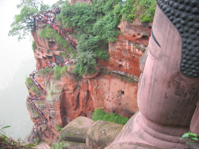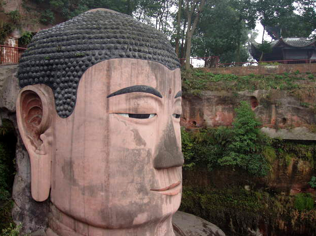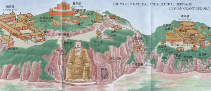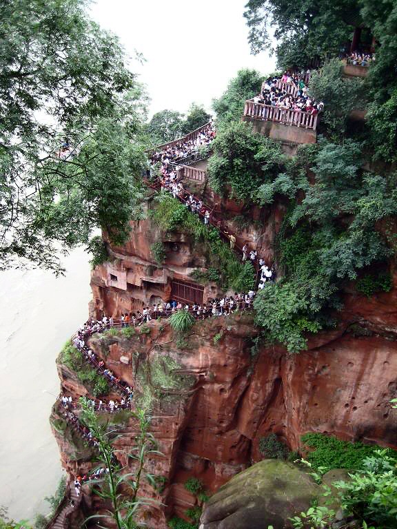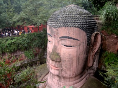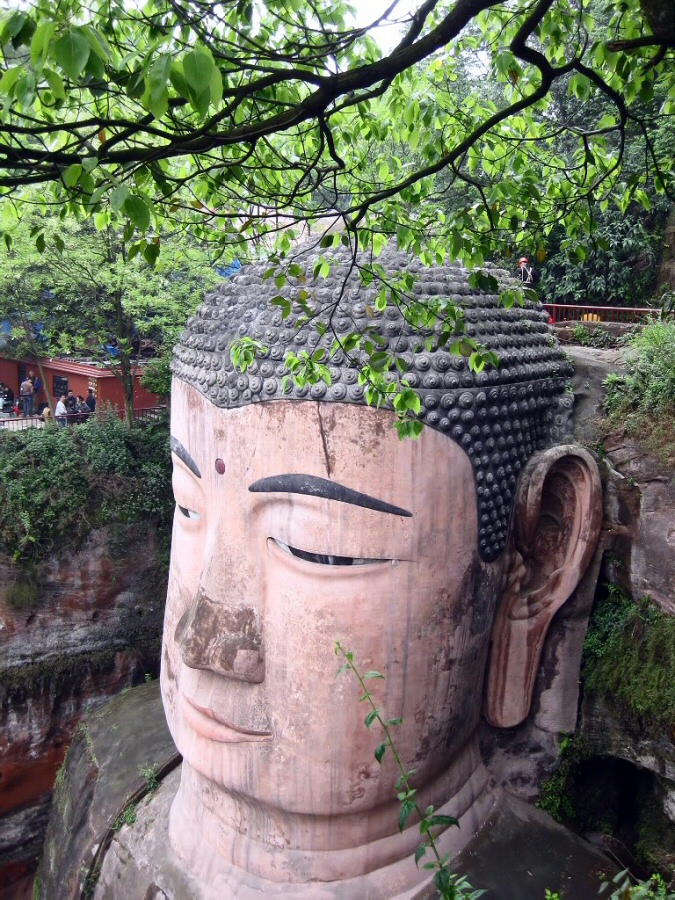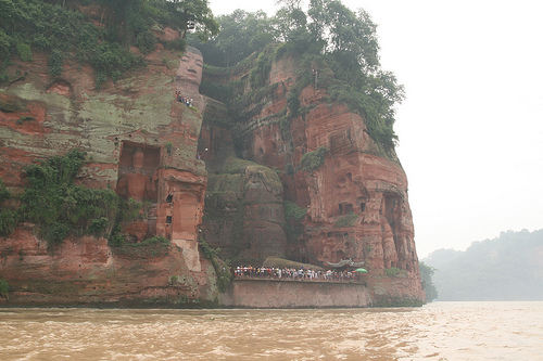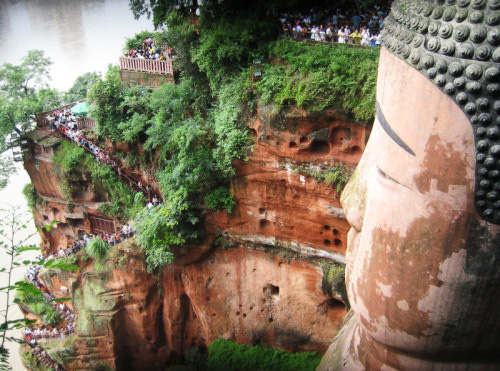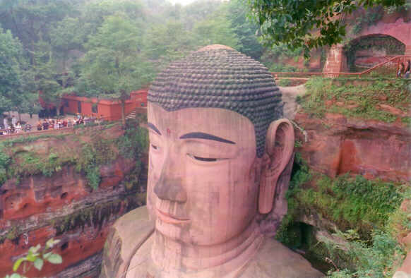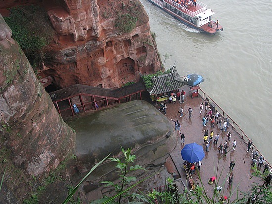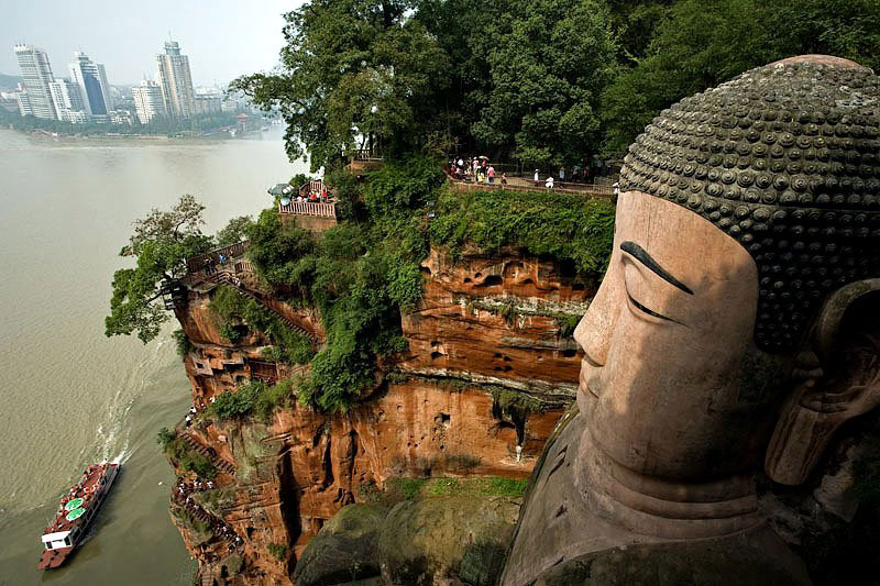 Las vistas desde los pies del Buda son igualmente imponentes, ya que la figura se alza majestuosa sobrecogiendo a cualquier espectador. También podemos montar en un ferry para ver una vista panorámica del Buda desde el río. Existe un dicho en la zona que reza así: «La montaña revela al Buda y el Buda esconde la montaña». Esto se corresponde con la vista que podemos ver cuando navegamos por el rio, con la imagen de la montaña y el Buda en su corazón durmiendo apaciblemente.