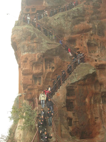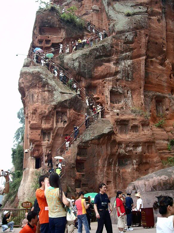 En la parte superior del acantilado, a la altura de la cabeza del Buda, existe una galería en la que los turistas pueden relajarse y apreciar los detalles de la cabeza. Al lado de los caminos del acantilado existen dos notables estatuas, talladas en la dinastía Tang. Los turistas también pueden observar sugestivas figuras de hadas, pabellones y pagodas, grabadas con meticulosos detalles y diseños que ilustran la sofisticación y la pericia del tallado que se efectuaba durante la dinastía Tang.