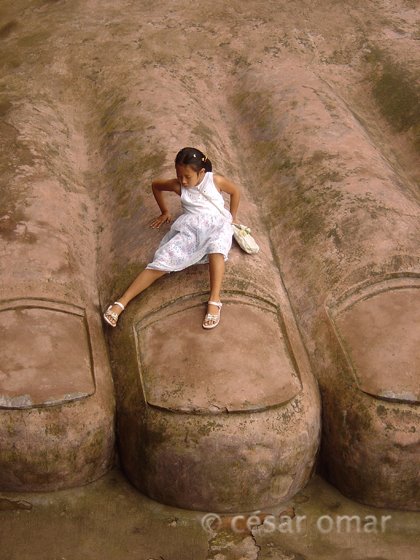 Cuando se fue erigiendo la estatua, se depositaron las piedras que sobraban del cincelado en el fondo del río. Esto provocó que las aguas del torrente, antes turbulentas, quedaran apaciguadas, por lo que aparentemente se cumplió el efecto benefactor del Buda.