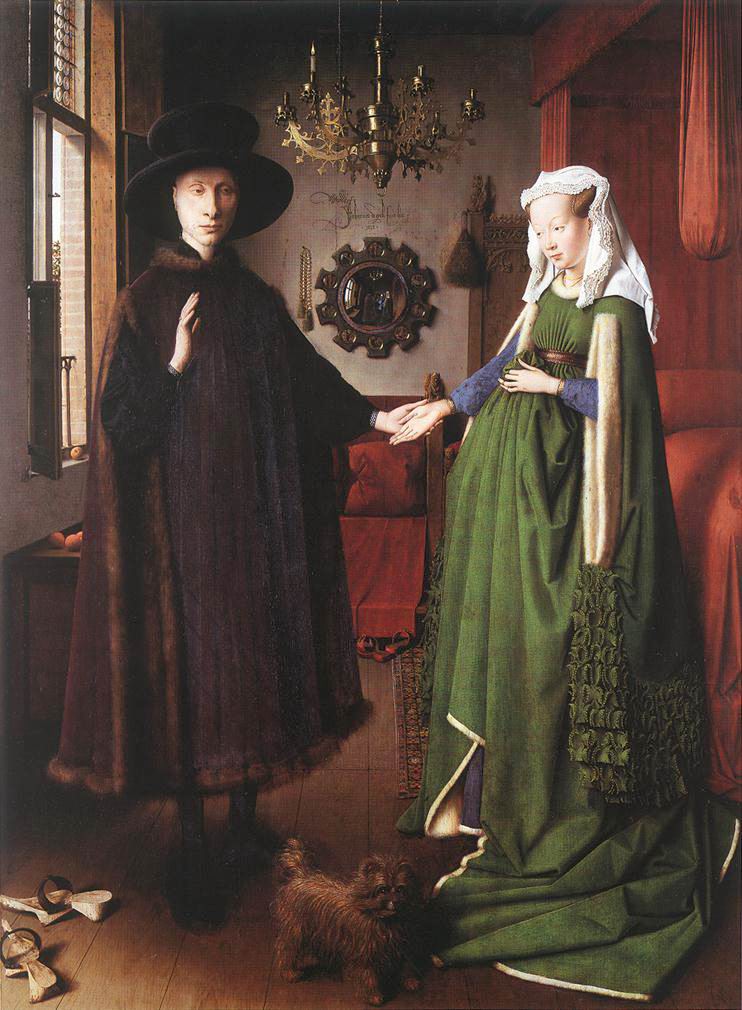 El cuadro «El Matrimonio Arnolfini» (1434, Jan Van Eyck), posee una belleza y una magia especial, aunque más bien misteriosa, y que a mi especialmente siempre me dio bastante mal rollo. Está plagado de simbologías encarnadas en numerosos objetos dispersos por la habitación que son en sí enigmáticos. Van Eyck los pintó como si fueran accesorios esparcidos de forma casual por toda la habitación.