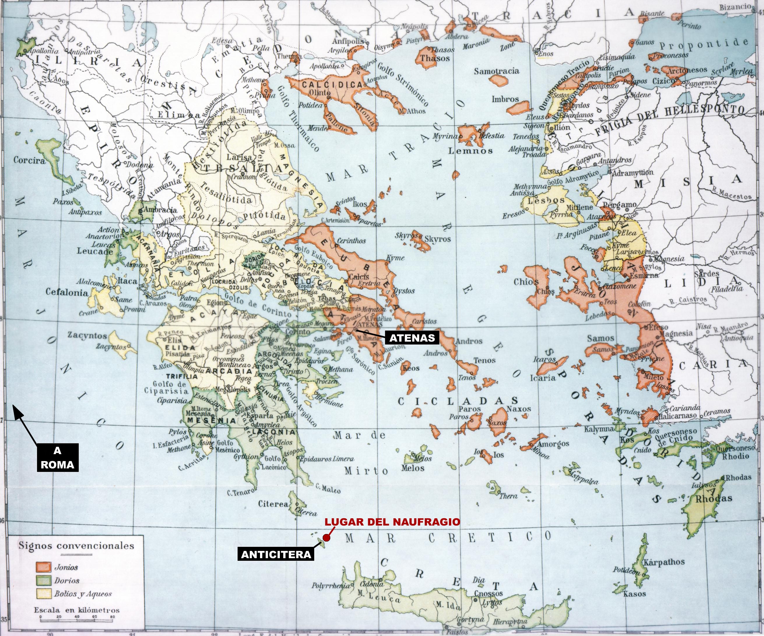 En abril de 1900, el buceador griego Elias Stadiatis halló un barco de carga naufragado cercano a la isla de Anticitera, entre las islas de Citera y Creta, a una profundidad de 42 a 60 metros. Los buceadores rescataron diversas estatuas y otros artefactos, entre los que se encontraba este compleja máquina descubierta por Valerios Stais.