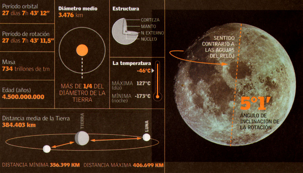 La Luna gira sobre sí misma y también alrededor de la Tierra, en una órbita que es ligeramente elíptica. Este satélite tarda 27 días, 7 horas, 43 minutos y 12 segundos en completar una órbita en torno a nuestro planeta, tiempo que coincide con su periodo de rotación. Como resultado de esta coincidencia, la Luna presenta siempre la misma cara cuando es observada desde la Tierra.