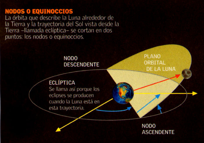 El plano orbital de la Luna forma un ángulo de 5,1º con la eclíptica, nombre que recibe el plano de la órbita de la Tierra alrededor del Sol. Los puntos en que la órbita de la Luna corta la eclíptica se llaman nodos. Hay un nodo ascendente y un nodo descendente, y este hecho tiene una estrecha relación con los eclipses, tanto de Sol como de Luna. Para que se produzca un eclipse de Luna, es decir, que la sombra de la Tierra caiga sobre la Luna y la tape, ésta debe encontrarse situada sobre un nodo, alineada con el Sol.