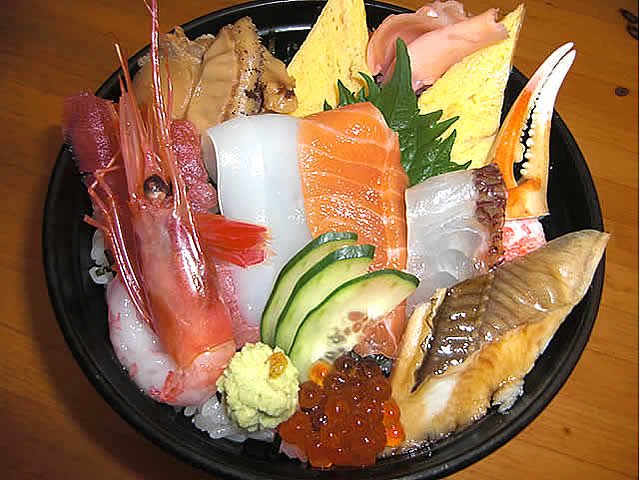 Chirashizushi: Se sirve un cuenco de arroz con trozos de pescado y otros ingredientes por encima.