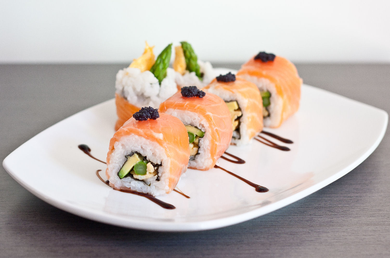 Uramaki: Es un sushi cilíndrico con dos o más rellenos cuya particularidad es que el arroz está fuera, mientras el nori está dentro.