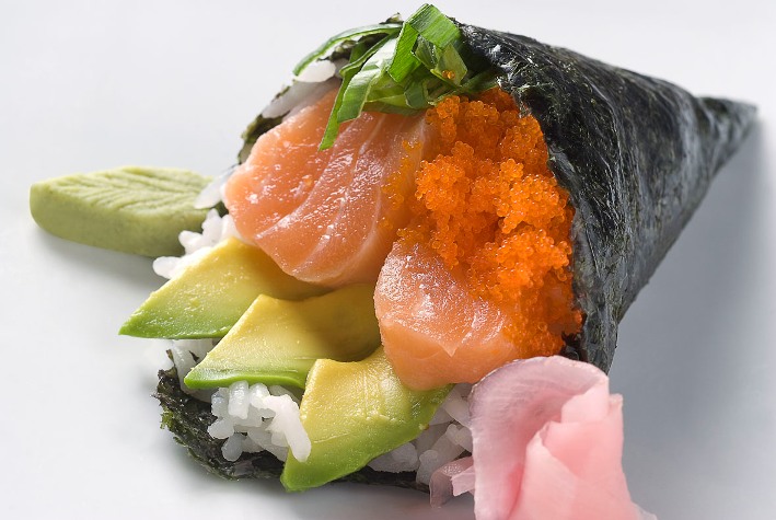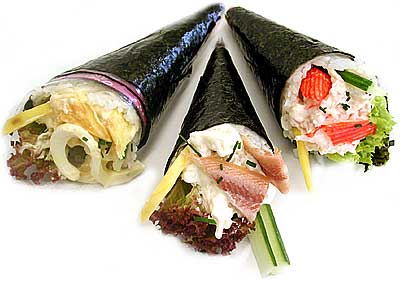 Temaki: Es una hoja de alga nori enrollada en forma de cono, rellena de sushi y otros ingredientes.