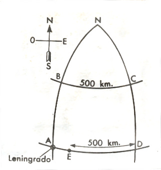 Como la longitud de un grado meridiano equivale a 111 km, el arco del meridiano de 500 km. contendrá 500 : 111 = 4 grados y medio. San Petersburgo está situado en el paralelo 50; por consiguiente, el punto B se encuentra en los 60º 4,5º = 64,5º. Después, el dirigible voló con rumbo Este, es decir, por el paralelo BC, y recorrió, siguiéndolo, 500 km.