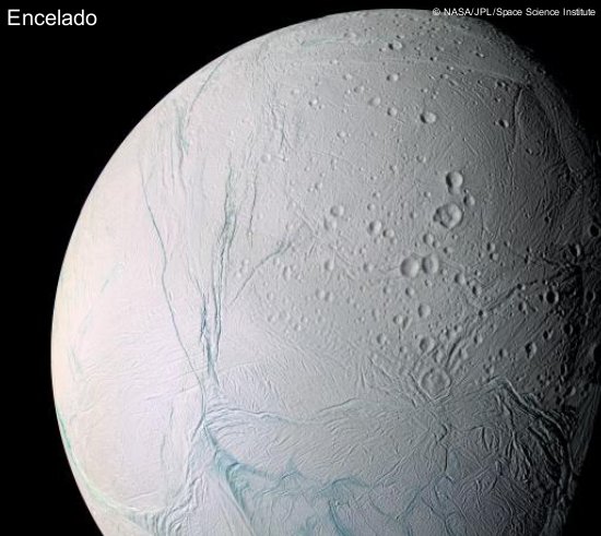 En el año 2005, la sonda Cassini realizó tres sobrevuelos en Encélado, la sexta luna -en tamaño- de Saturno (comenzando por Titán, la mayor). Descubierta por Herschel en 1789, se trata de una luna pequeña (algo más de 500 km de diámetro), se suponía que era helada y ligera, y que orbitaba a algo menos de 250.000 km del planeta, justo en el borde interior del anillo E. De Encélado.